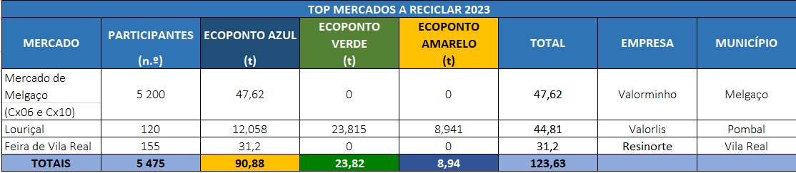 O Mercado de Melgaço liderou esta iniciativa com 47,62 toneladas de papel/cartão. Neste top, em 2º lugar, ficou o Mercado do Louriçal com 44,81 toneladas: 12,058 de papel/cartão, 23,815 de vidro e 8,941 de plástico e metal. E num honroso 3º lugar, a Feira de Vila Real que separou para reciclar 31,20 toneladas de papel/cartão.